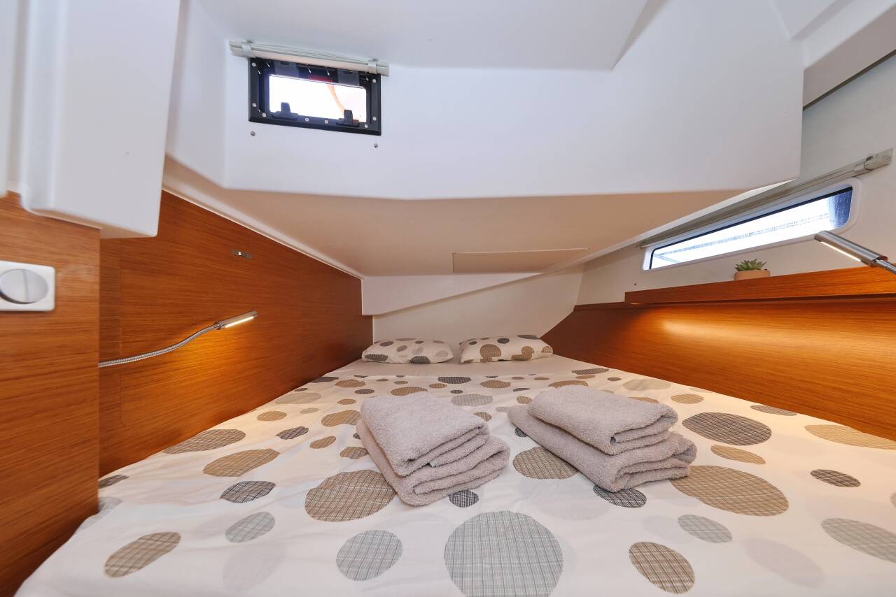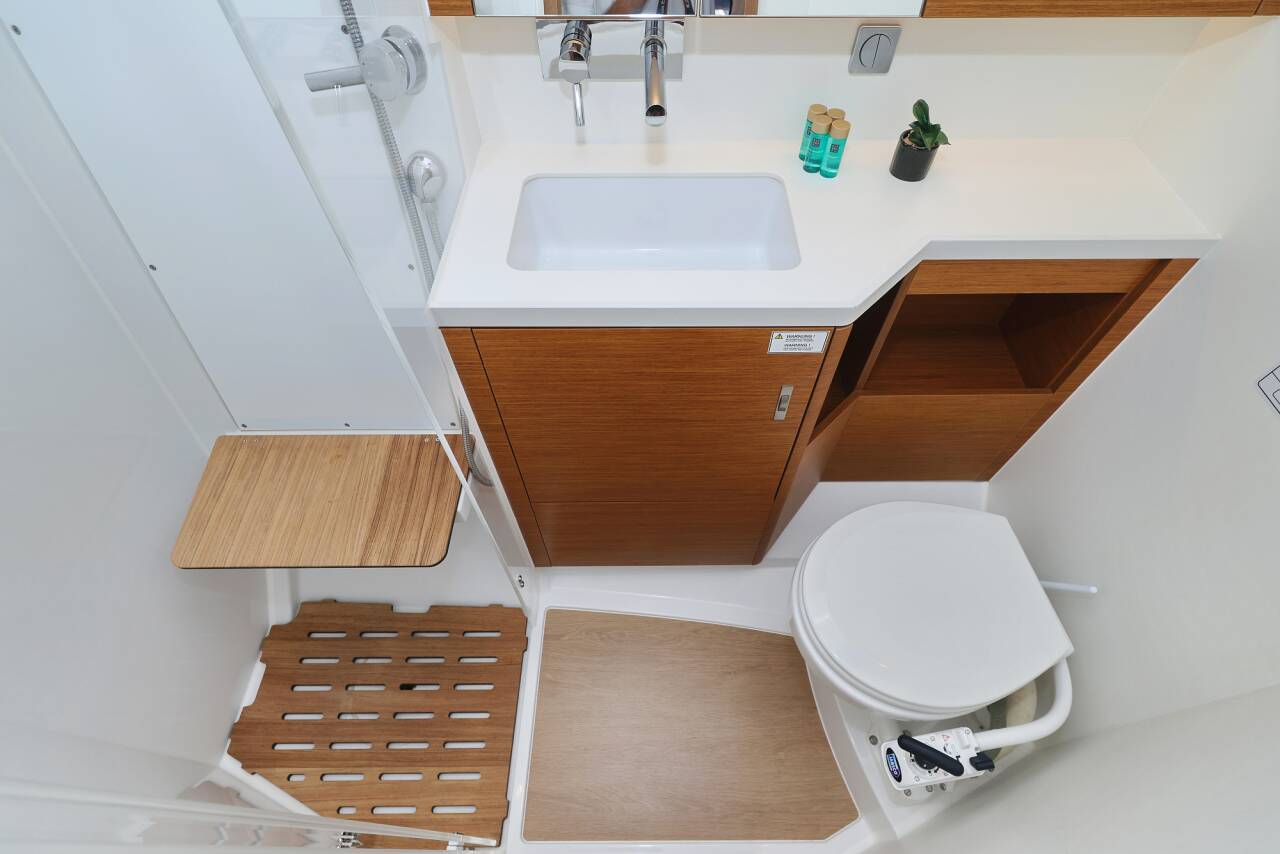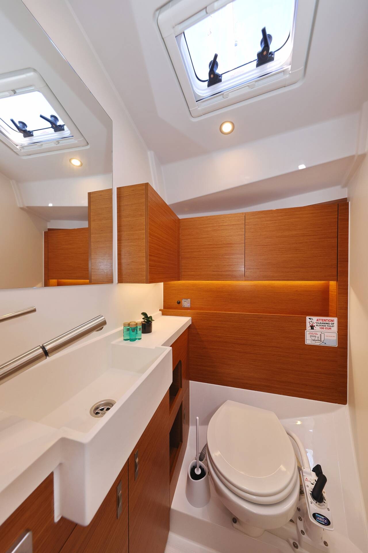 C2: L-galley on port and head with separate shower stall on stb. 2 aft cabins with double berth, locker and storage.
