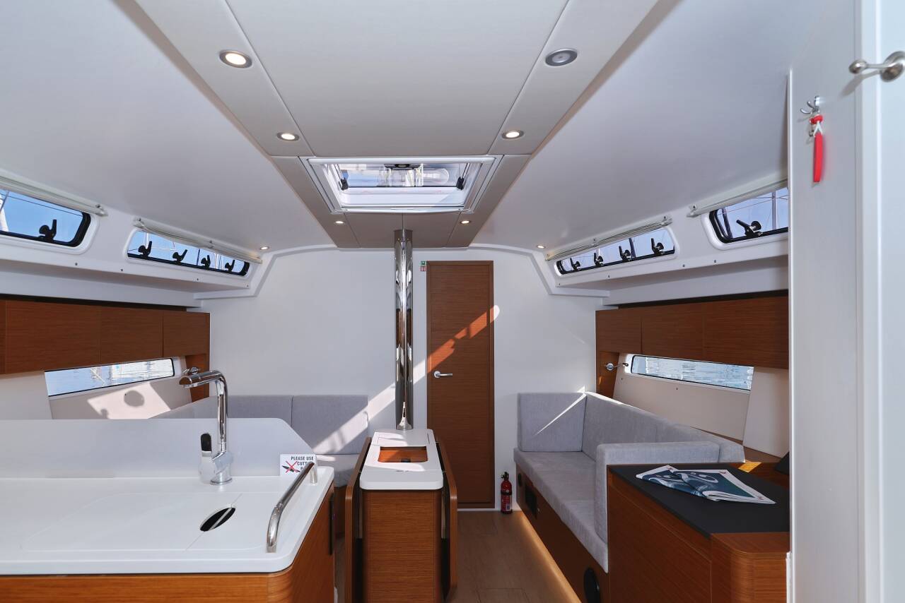 B3: Saloon with large dining area on port and sofa with multi function unit, navigation console and storage on stb