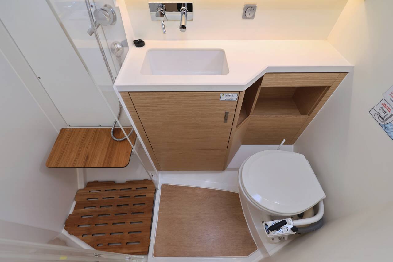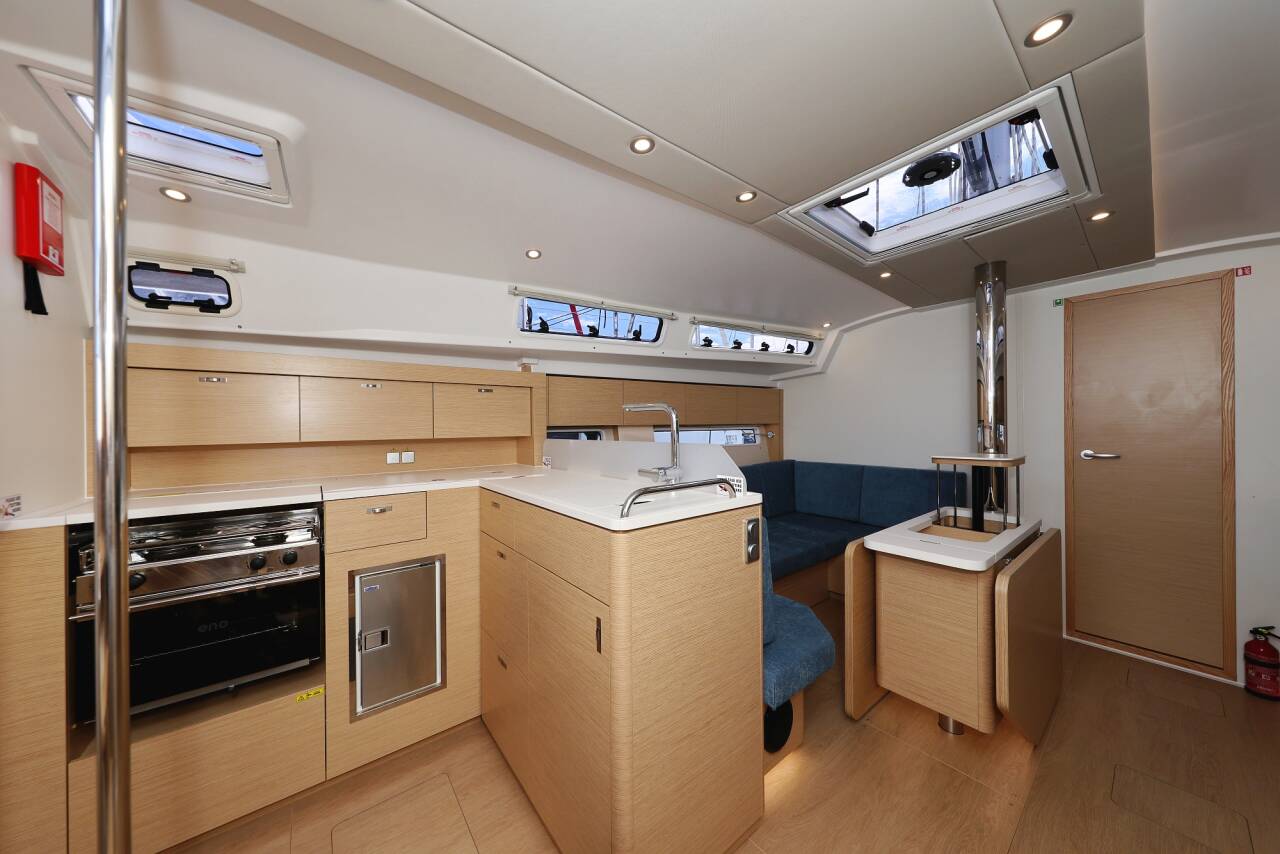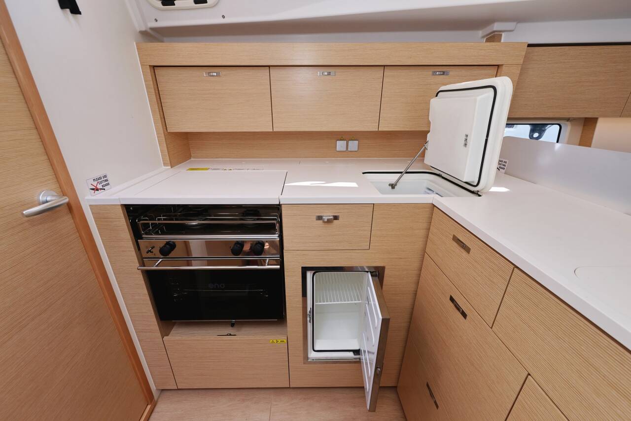 C2: L-galley on port and head with separate shower stall on stb. 2 aft cabins with double berth, locker and storage.
