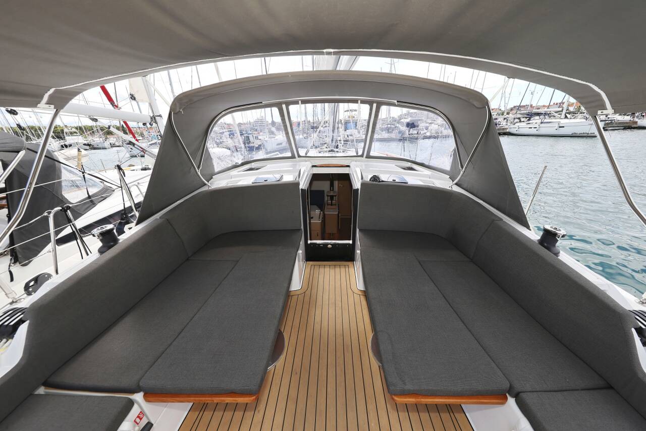 2 cockpit tables with teak top, electrically lowerable into sunbed incl. upholstery